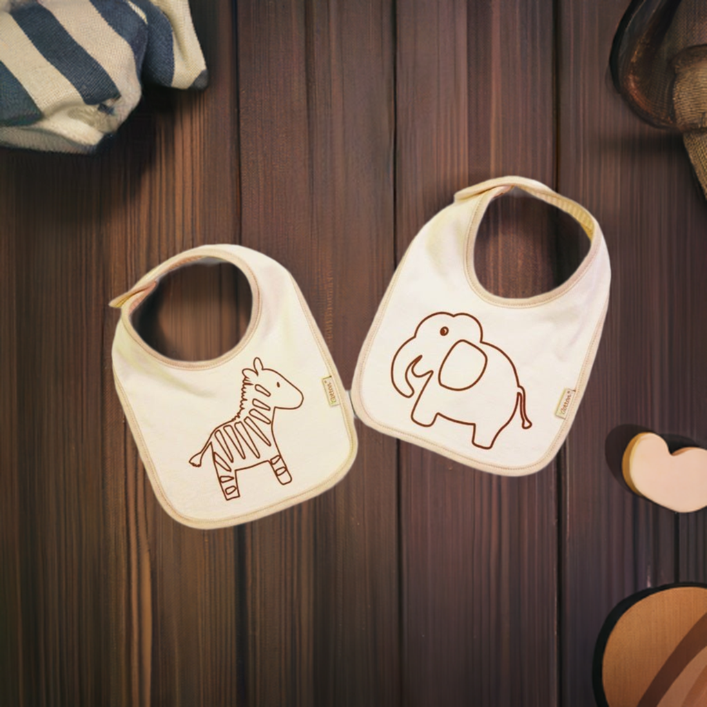 Featuring adorable designs including 2pcs with Zebra & Elephant prints, and 3 different colors - Milk White, Light Caramel, and Stripes, our bibs add a cute and charming touch to your baby's attire. This set not only meets the highest standards of quality but is also an affordable choice for eco-conscious parents.